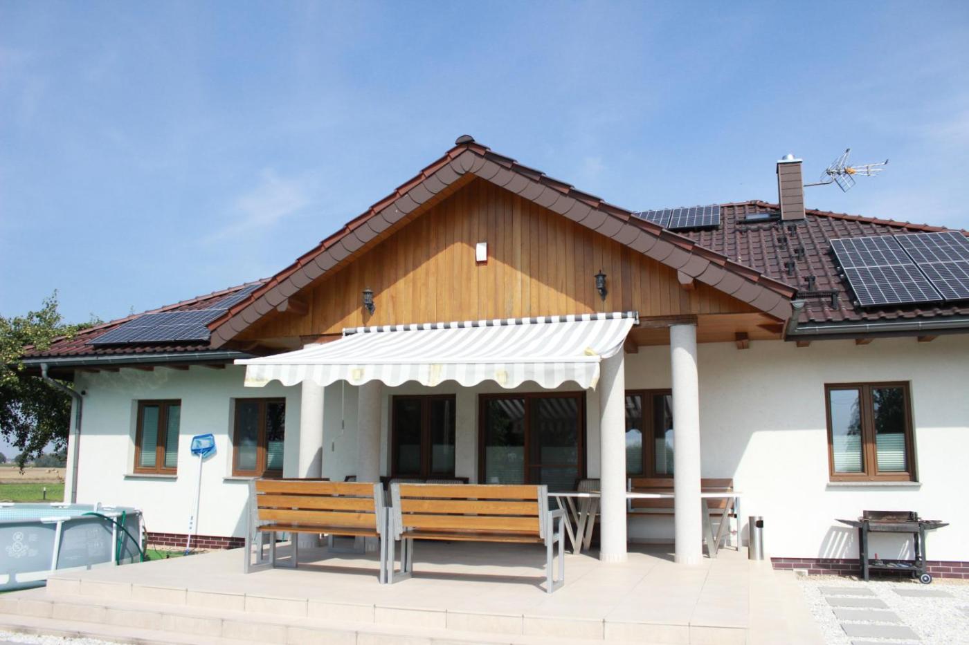 Willa typu Deluxe. Guests will have a special experience as this villa provides a pool with a view, a hot tub and a sauna. This spacious villa includes 2 living rooms, 3 separate bedrooms and 2 bathrooms with a walk-in shower and a bath. Guests will find a stovetop, a refrigerator, a dishwasher and kitchenware in the kitchen. The villa also features a barbecue. Boasting a terrace with garden views, this villa also offers a washing machine and a flat-screen TV. The unit has 5 beds. Willa - 10 osobowy. Powierzchnia pokoju ok.: 280 mkw.