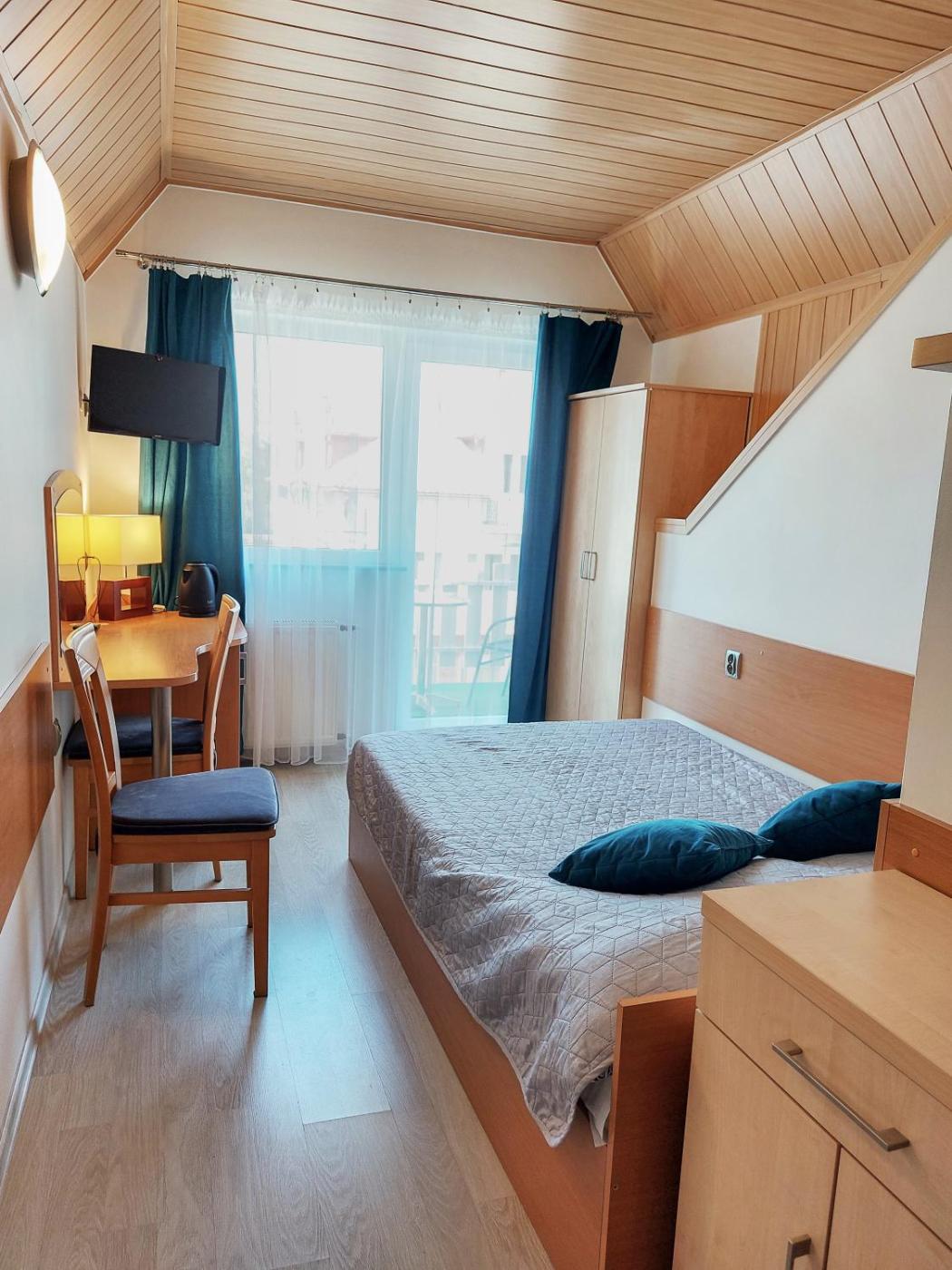 Pokój Dwuosobowy z balkonem. Jest to pokój dwuosobowy z prywatną łazienką, szafą, czajnikiem elektrycznym oraz balkonem. Do dyspozycji gości jest 1 łóżko. Pokój Dwuosobowy - 2 osobowy. Powierzchnia pokoju ok.: 11 mkw. ;