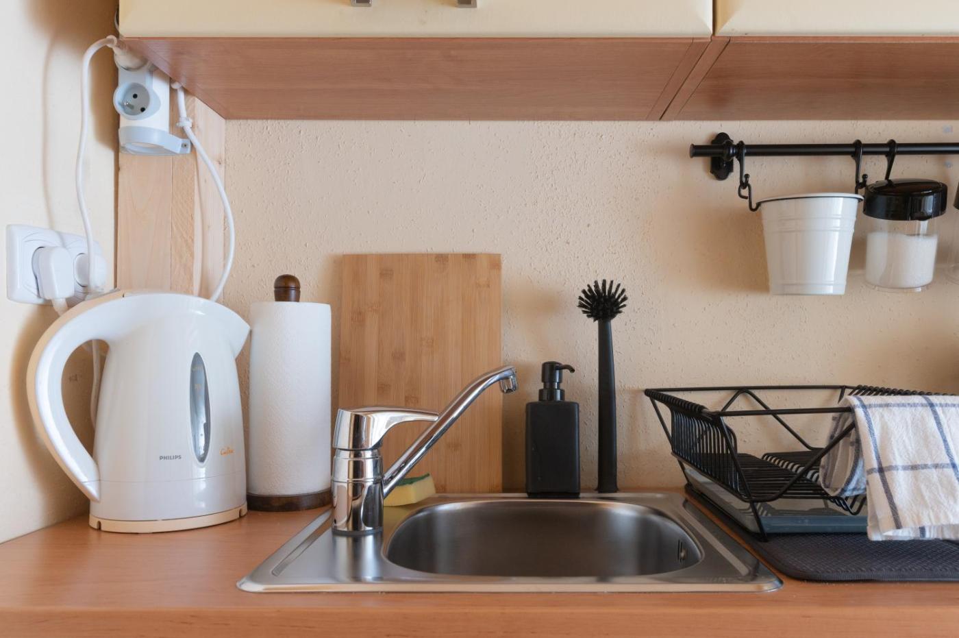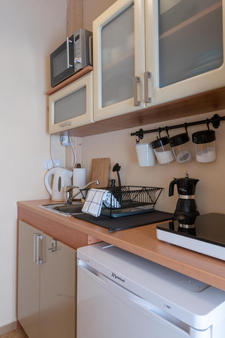 Wyposażenie kuchni obejmuje także lodówkę, mikrofalówkę, płytę kuchenną i ekspres do kawy.