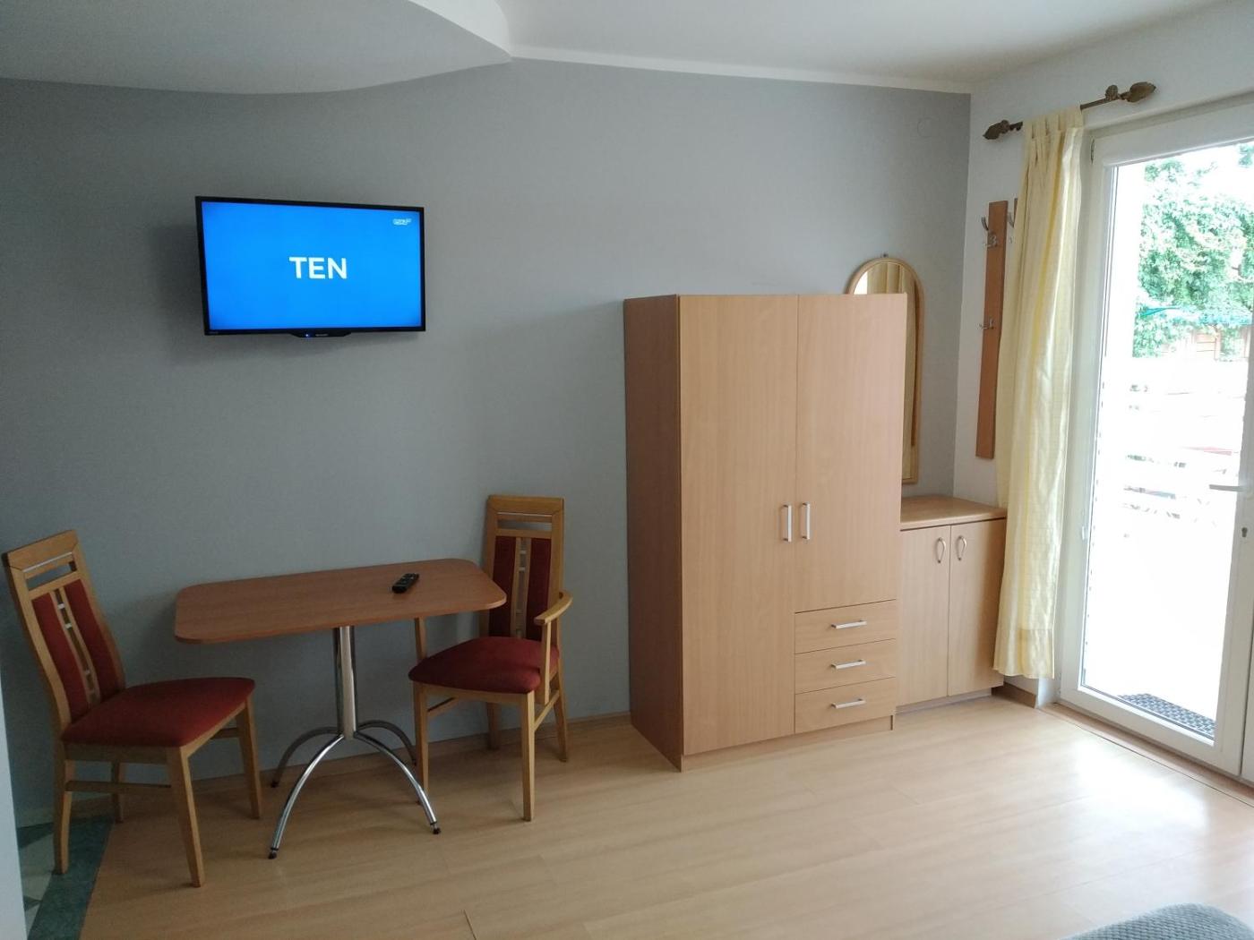 Pokój Dwuosobowy typu Deluxe (2 osoby dorosłe + 1 dziecko). Providing free toiletries, this double room includes a private bathroom with a walk-in shower. The well-equipped kitchenette features a stovetop, a refrigerator, kitchenware and a tea and coffee maker. Featuring an outdoor dining area, this double room also provides a private entrance, a dining area and a flat-screen TV. The unit offers 1 bed. Pokój Dwuosobowy - 2 osobowy. Powierzchnia pokoju ok.: 17 mkw.