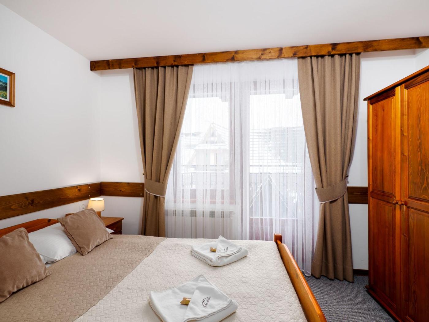 Pokój czteroosobowy z widokiem na góry. Offering free toiletries, this quadruple room includes a private bathroom with a shower. The quadruple room offers a wardrobe, a carpeted floor, heating, a flat-screen TV with cable channels, as well as garden views. The unit has 3 beds. Pokój Czteroosobowy - 4 osobowy. Powierzchnia pokoju ok.: 20 mkw. ;