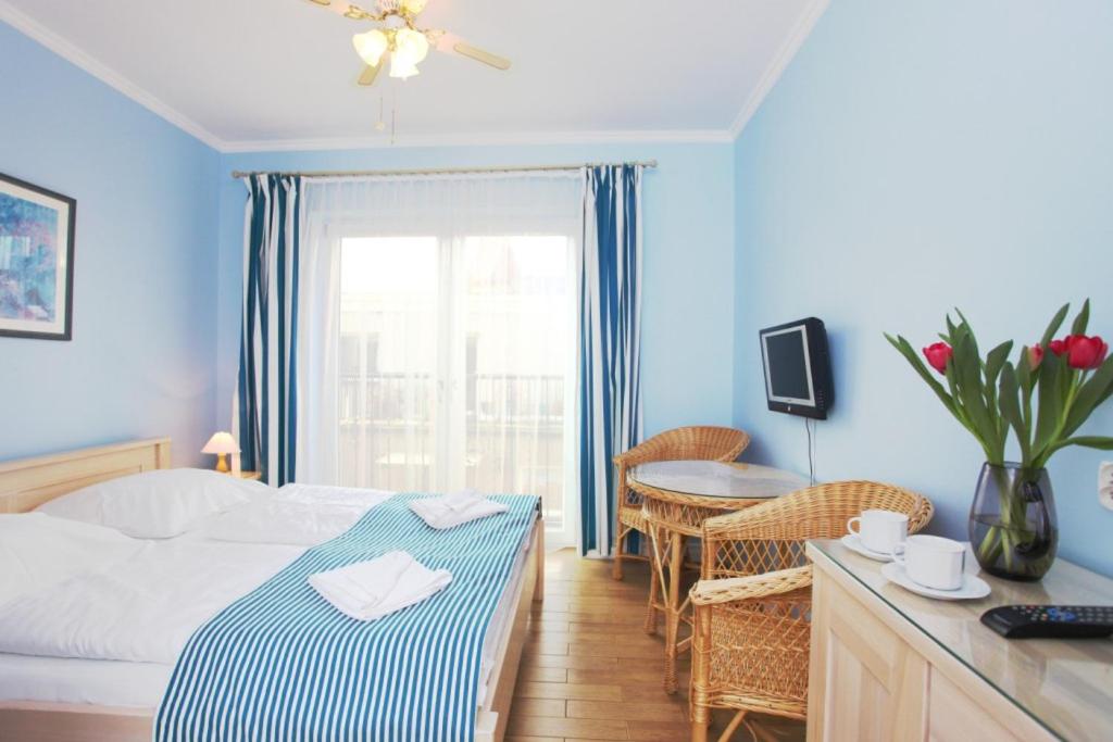 Pokój dwuosobowy. Jest to pokój dwuosobowy z balkonem francuskim i podłogą wyłożoną kafelkami. Wyposażenie pokoju obejmuje czajnik elektryczny, lodówkę i suszarkę do włosów. Dla Gości przygotowano także sprzęt plażowy (parawan, leżak i koc plażowy). Powierzchnia pokoju ok.: 12 mkw. ;