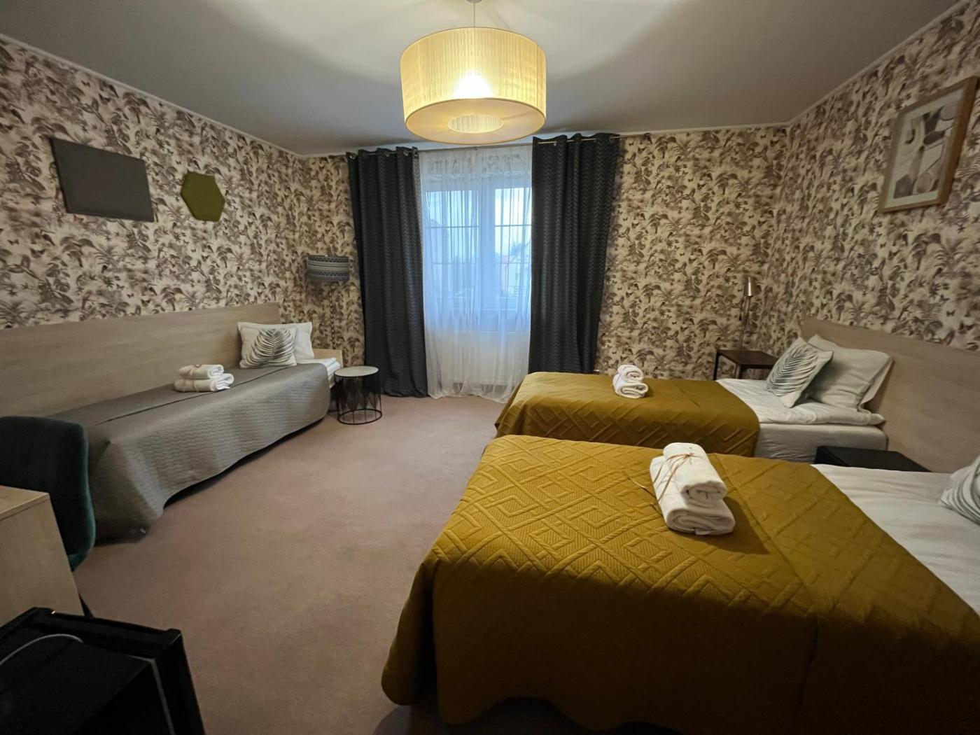 Pokój Trzyosobowy typu Comfort. Offering free toiletries, this triple room includes a private bathroom with a shower and a hairdryer. The triple room offers a flat-screen TV with cable channels, soundproof walls, a tea and coffee maker, a seating area as well as garden views. The unit has 3 beds. Pokój Trzyosobowy - 3 osobowy. Powierzchnia pokoju ok.: 19 mkw. ;