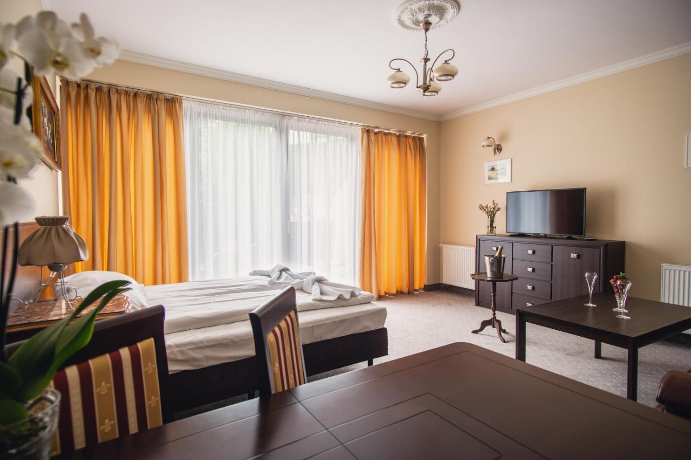 Apartament z tarasem. Ten apartament mieści oddzielną sypialnię, salon oraz łazienkę z prysznicem i bezpłatnym zestawem kosmetyków. W aneksie kuchennym przygotowano lodówkę, płytę kuchenną oraz przybory kuchenne. Pozostałe udogodnienia obejmują zestaw do parzenia kawy i herbaty oraz telewizor z płaskim ekranem. Z tarasu roztacza się widok na ogród. W tej opcji zakwaterowania do dyspozycji gości są 3 łóżka. Apartament - 5 osobowy. Powierzchnia pokoju ok.: 50 mkw. ;