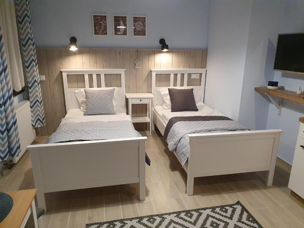 Apartament. This apartment includes 1 living room, 1 separate bedroom and 1 bathroom with a walk-in shower and a hairdryer. In the fully equipped kitchen, guests will find a stovetop, a refrigerator, kitchenware and an electric kettle. This apartment has a dining area, a wardrobe, a flat-screen TV with cable channels and an outdoor dining area. The unit has 2 beds. Apartament - 3 osobowy. Powierzchnia pokoju ok.: 20 mkw. ;