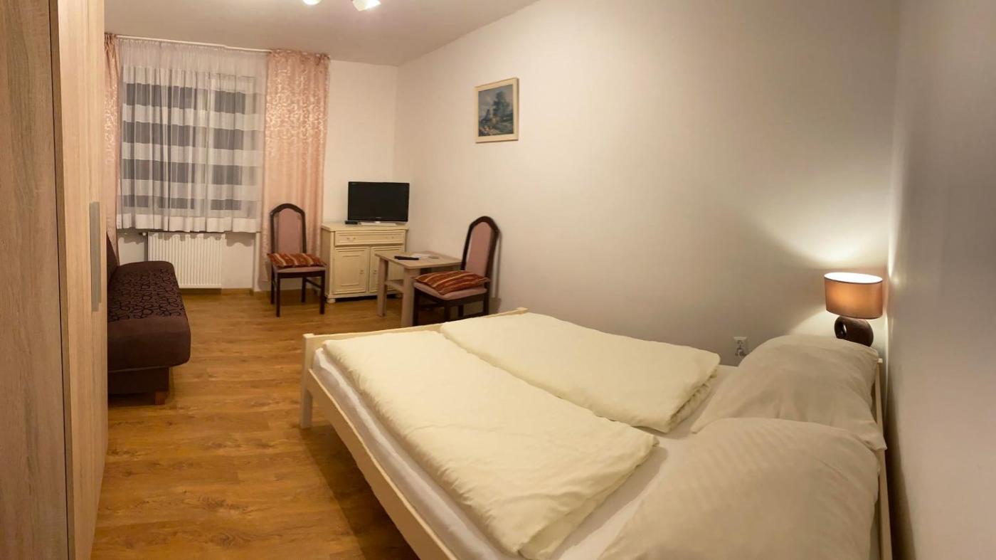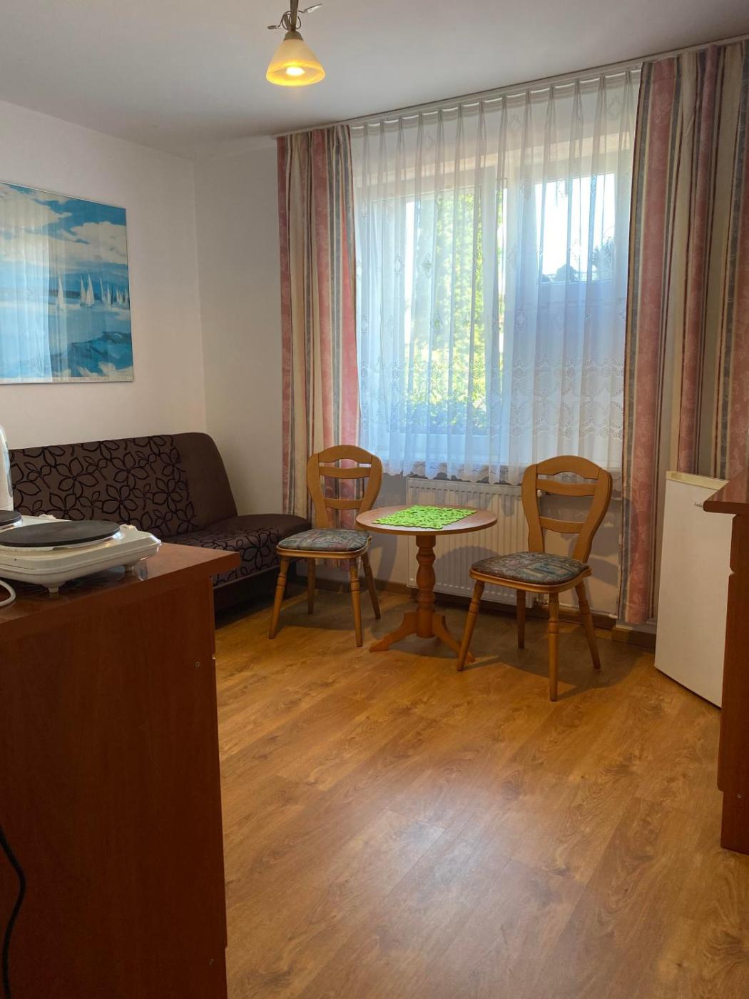 Apartament – parter. Boasting a private entrance, this apartment features 1 living room, 1 separate bedroom and 1 bathroom with a shower and a hairdryer. The apartments kitchenette, which has a refrigerator and kitchenware, is available for cooking and storing food. The apartment features a flat-screen TV, a wardrobe, an electric kettle, parquet floors as well as garden views. The unit has 3 beds. Apartament - 4 osobowy. Powierzchnia pokoju ok.: 24 mkw.